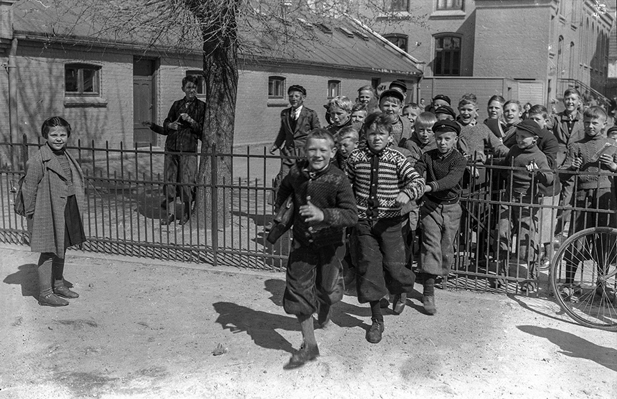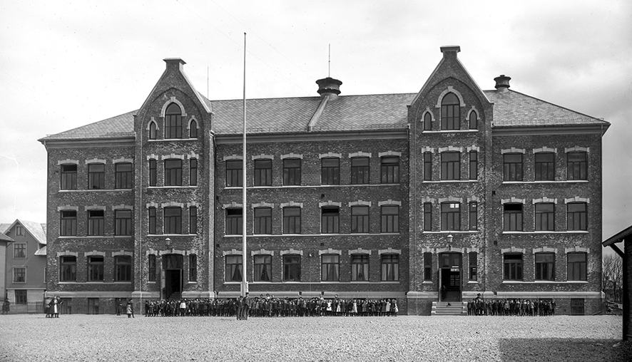 Skolen ble tatt i bruk 18. august 1902 og bildet er nesten like gammelt. Den tre etasjers murbygningen ble tegnet av Hans L. Juell, som også var prosjektleder for byggingen. Den besto av 22 klasserom, pluss en kjelleretasje med sløydrom, bad og rom for sentralfyring. I tillegg ble det reist et ekstra bygg til gymsal og vaktmesterbolig. Siden elevene var delt i jente- og gutteklasser, ble det også laget egen inngang for jenter og gutter. Guttene brukte den venstre inngangen av skolen og jentene den høyre. Det samme gjaldt for lærerne.Fotograf: Carl Johan Jacobsen (1863-1919). Stavanger byarkiv.Elever i skolegården