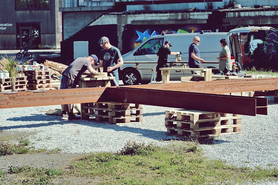 Geir Bakken fortalte om Norges første supergrønne urbane folkehøgskole som kan komme i Pedersgata. Mange interesserte og noen potensielle samarbeidspartnere møtte opp. Et videoforedrag fra Gonçalo Lopes fra Portugal gjorde inntrykk! Han er arkitekt og del av et kollektiv som beriker byen og festivaler med midlertidige installasjoner/intervensjoner som utforsker samspillet mellom mennesker i byrommet. Vi hadde boklansering med Arild Rein, Brita Strand Rangnes (Villhund forlag) og Espen Birkedal (tegneserieboken ‘Nybegynner’). Dette var det best besøkte arrangementet til nå, forteller Benjamin. – På lørdag ble det bygget en 15 meter lang grill og utemøbler formet etter innspill fra naboer og andre innbyggere. Hvordan kan vi samhandle, treffe mennesker utover vår egen familie, være med fremmede? var spørsmålet som Ketil Dybvig stilte med arrangementet ‘Kjærlighet og pølser i koronaens tid’. Grillen og møblene er til fri bruk på ventetomten. Byverksted er en del av Skaus fase 4 med todelte parallelle utstillinger på Rogaland Kunstsenter (Nytorget) og ventetomten ved Tou. Siden februar i år har en rekke kunstnere og kunstnergrupper i flere prosjektfaser arbeidet parallelt på rommet (kunstsenteret) og stedet (ventetomten). – Det som er viktigst for Byverksted er fellesskapet, samarbeid og at det er hvem som helst som kan være med og som kan ta initiativ. Byverksted ønsker å vise at innbyggerne kan påvirke byutviklingen, og at demokratiet består ikke bare av valg hvert fjerde år. Vi håper at kommunen legger bedre til rette for at lignende engasjement nedenfra får bidra til bedre nærmiljøer og et mer inkluderende samfunn, avslutter Benjamin.Program