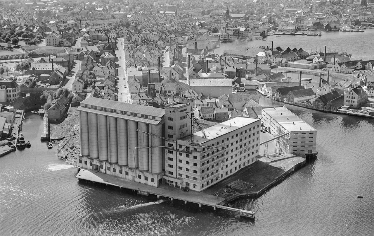 Nordkronens anlegg med siloer, mølle, mellager og posepakkeri ytterst på Strømsteinen. Fra venstre ses den ene dokken i Spilderhaugvigå, Spilderhauggata og Dokksmauet. Pedersgatas rette gateløp er omtrent midt i bildet. Mot høyre ses Øvre og Nedre Banegate, Verket, Banavigå, Verven, Badehusgata, Badedammen og Svankevigå. Mellom arbeiderboligene, rett bak siloene, ses rester av «Myllå» på Møllehaugen. – Vi skal bevare sokkelen til Nordkronens siloanlegg, sier Ane S. Dahl. – Når rivejobben er utført vil det bli lagt nytt dekke over dette planet. Hvis foreslått regulering blir en realitet blir dette et felles grønt tak i fremtiden. Det gamle Møllebygget, midt i bildet, skal også bevares. Widerøes flyfotosamling/Stavanger Byarkiv, datert 31.05.1951.