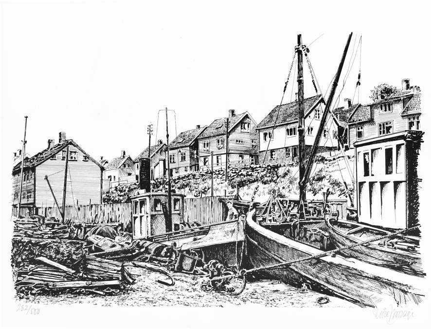 Kåre Mossiges tegning viser hvordan det så ut ved Dokk 1 i 1950-60 årene.