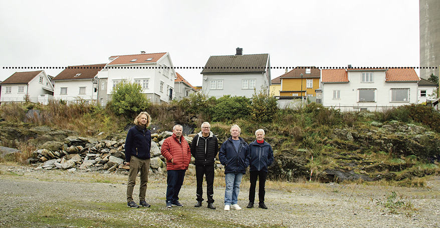 – Vi satte opp lekter i Dokksmauet. Den ene lekteren ses helt til høyre og så er høyden markert med en prikket linje på bildet, forklarer Johnny Emanuelsen som er leder i Storhaug historielag. Fra venstre beboer Øystein Lunde Ohna, Torbjørn Berg, Reidar Asgautsen, Johnny Emanuelsen og Petter Norheim. De fire til høyre er styret i historielaget.