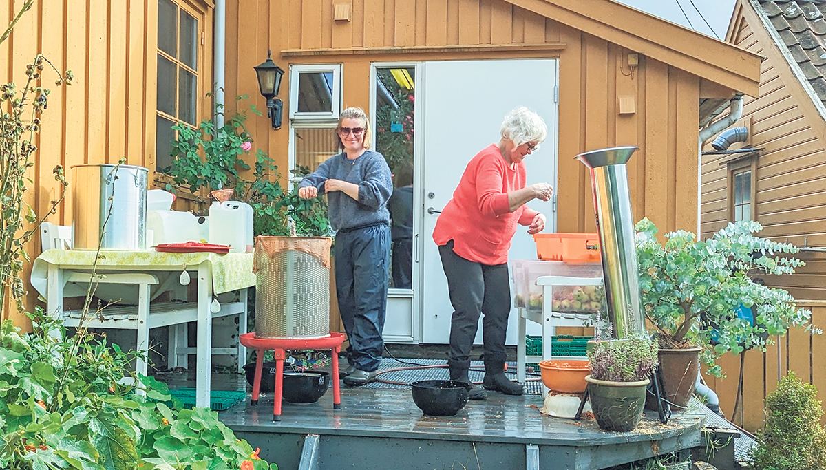 – Vi har et eldgammelt epletre på en flekk av hagen i Karlsminnegata, forklarer Jan. – Eplene er av ukjent type, små og store, og ikke noe særlig til å spise. Men de gir den alle beste juice og er fantastiske i eplekaker. På Bergeland bydelssenter fikk vi hjelp til pressinga i trivelig selskap med Eldbjørg. Resultatet er både kortreist, hjemmelaga og uten tilsettingsstoffer.