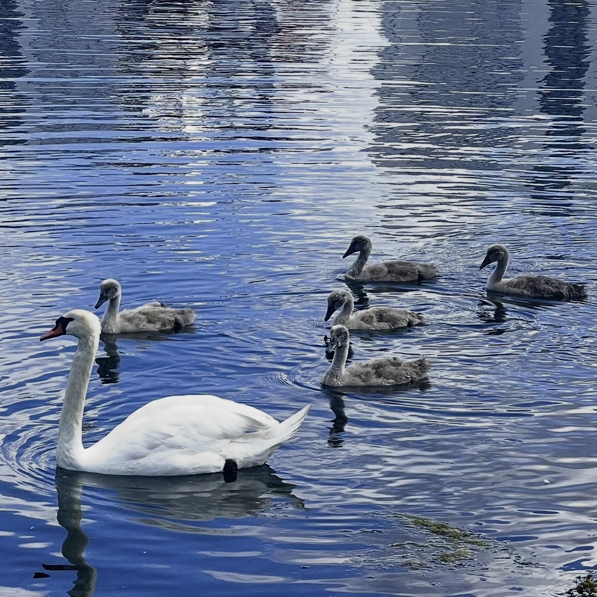 Dei kjem hit kvar dag. Eg har utsikt til parken der dei for det meste oppheld seg, og til kanalen der dei elegant kjem glidande innover. Som seglskuter. Om kvelden dreg dei sin veg. Dei pendlar. Kvar dei kjem ifrå og reiser til, anar eg ikkje. Dei vil vel ha fred om kveldane og natta. Svaner held saman heile livet. Dei er monogame og trufaste. - At dei aldri blei leie av kvarandre, tenkjer eg. - Der den eine er, kan du vere sikker på at den andre er òg». Dei er nesten som synkronsymjarar. Når dei eine pussar fjærene, gjer den andre det òg. Leitar ei av dei opp ein sølepytt for å drikke, følgjer den andre med. Vil den eine symje i kanalen, er det ikkje nei i den andre sitt nebb. Eg har til og med sett dei ha seg med kvarandre mitt i alle sitt påsyn. Svanedansen forut, parringdansen, er vakker og elegant. Som ballett. Inn imellom formar halsane deira eit hjarte. Eg må bryte saman og tilstå at eg er litt redd dei. Spesielt Svanung. Han kan vere ganske så hissig. Det er tydeleg å sjå når humøret ikkje er heilt på topp. Då bles han seg opp og legg hovudet ned mot halsen. Det er spesielt svaneinntrengjarar som får han i elendig humør. Dette er hans og Svanhild sitt revir. Andre får pinadø halde seg unna. Han går etter dei ubudne gjestane. Fortare og fortare. Jagar dei ut i kanalen. Tykkjer han dei er for treige til å komme seg unna, fer han etter dei ut i vatnet. Om det er nødvendig, tar han til vengjene og jagar dei til huttaheiti. Av og til er Svanung her åleine. I opptil tre veker. I fjor la eg spesielt merke til det. Ein dag sto han utanfor nabobygget og hakka med nebbet mot ei speilglasrute. Han såg sitt eige speilbilde. Eg hadde så vondt av han. Var han blitt enkjemann? Var Svanhild død? Var det eit desperat forsøk på å finne seg ein ny partnar? Nokre dagar etter, kom han og Svanhild stolt seglande innover kanalen. Med to ungar mellom seg. Den eine ungen forsvann, forresten. Kanskje eit rovdyr tok han? Den andre fekk vi sjå utvikle seg på H. C. Andersen-vis frå grått dun-nyste til full, kvit seglføring. I år kom dei forsyne meg svømmande på lang rekkje med fem ungar mellom seg. Svanung er forresten ikkje nådig når han er småbarnsfar. Då jagar han også menneskje som kjem dei for nære. Eg passar på å gå omvegar når han er i det lunet.svanesang