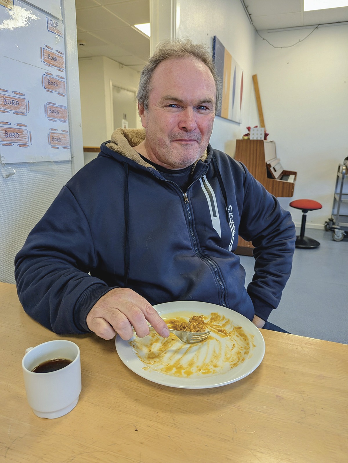 Maten ble nesten helt spist opp før jeg rakk å ta bilde! Johnny Svensson fra Nylund var her for første gang og satte pris på maten. – På onsdag skal jeg spise kjøttkaker med ertestuing på Kafé Sjøsiden (på Lervig sykehjem), sier Johnny.