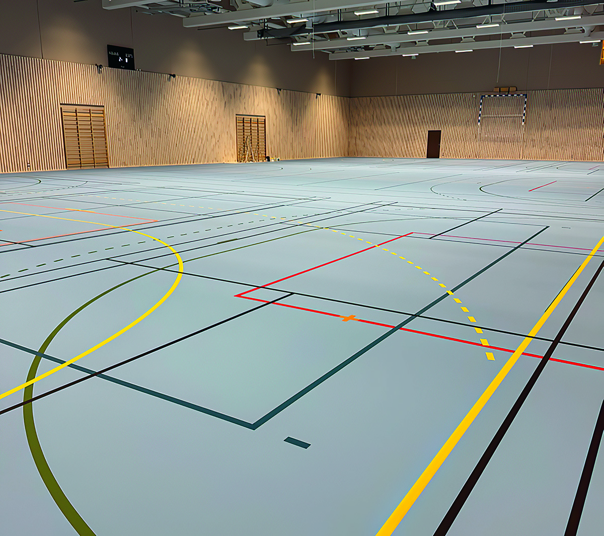 Volleyballbane i 3 baner, dvs 1 bane per sal med hylser i gulvet for stenger/nettBasketballbane i 3 baner, dvs 1 bane per sal